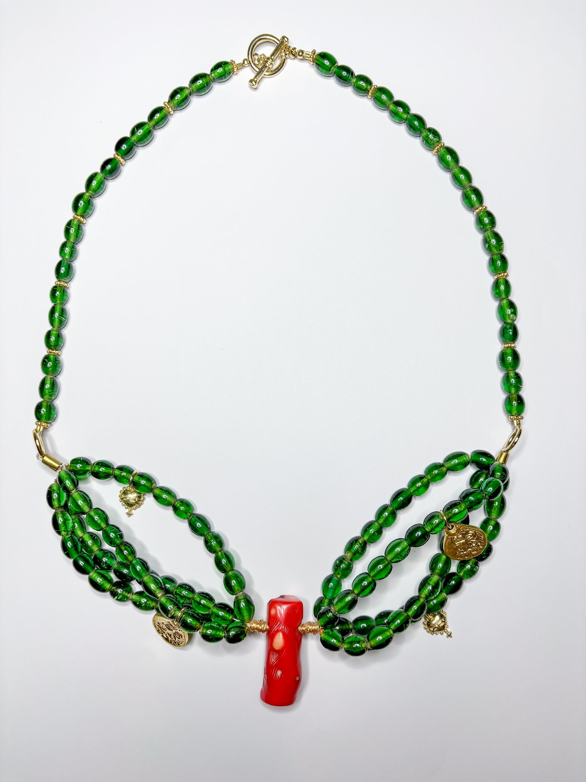 Collar "Esencia Verde" – Coral Natural, Vidrio Nepalí y Detalles en Oro